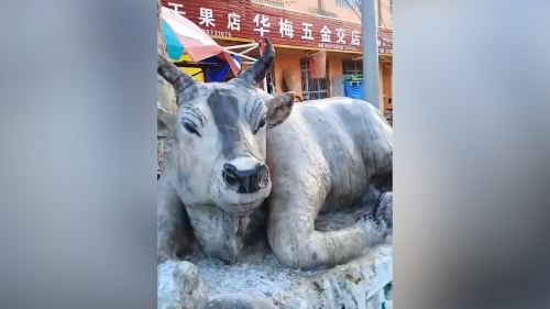 伊犁“冰牛”大叔又添新作,凭想象用积雪再雕一头跪卧骆驼