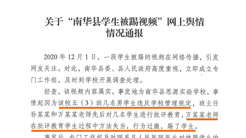 12月1日 有网友爆料,云南楚雄州南华县有老师飞踢小学生。视频中该教师脱掉外套后,连续踹倒4名小学生。南华县教体局对此回应,已成立专组介入调查,正在与师生家长沟通。对于网传踢人教师为东南大学支教研究生一事,南华县教育局没有正面回复,记者致电东南大学,暂未得到回应。